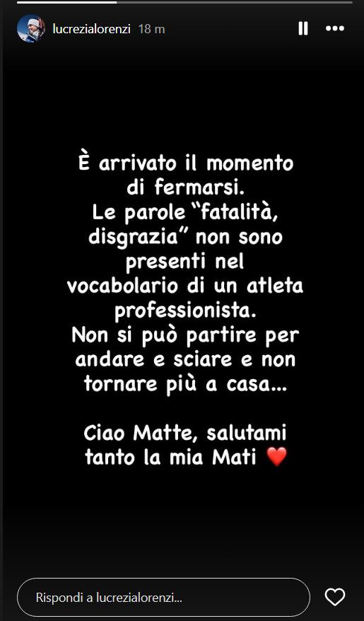 Lucrezia Lorenzi ha condiviso un commovente messaggio sui social, ricordando il fratello Matteo Franzoso, scomparso tragicamente a causa di un incidente durante gli allenamenti in Cile. La sorella di Matilde Lorenzi, la sciatrice della nazionale deceduta meno di un anno fa in Val Senales, ha espresso il suo dolore con parole toccanti: “E’ arrivato il momento di fermarsi. Le parole fatalità e disgrazia non sono presenti nel vocabolario di un atleta professionista. Non si può partire per andare a sciare e non tornare più a casa. Ciao Matte, salutami tanto Mati”.