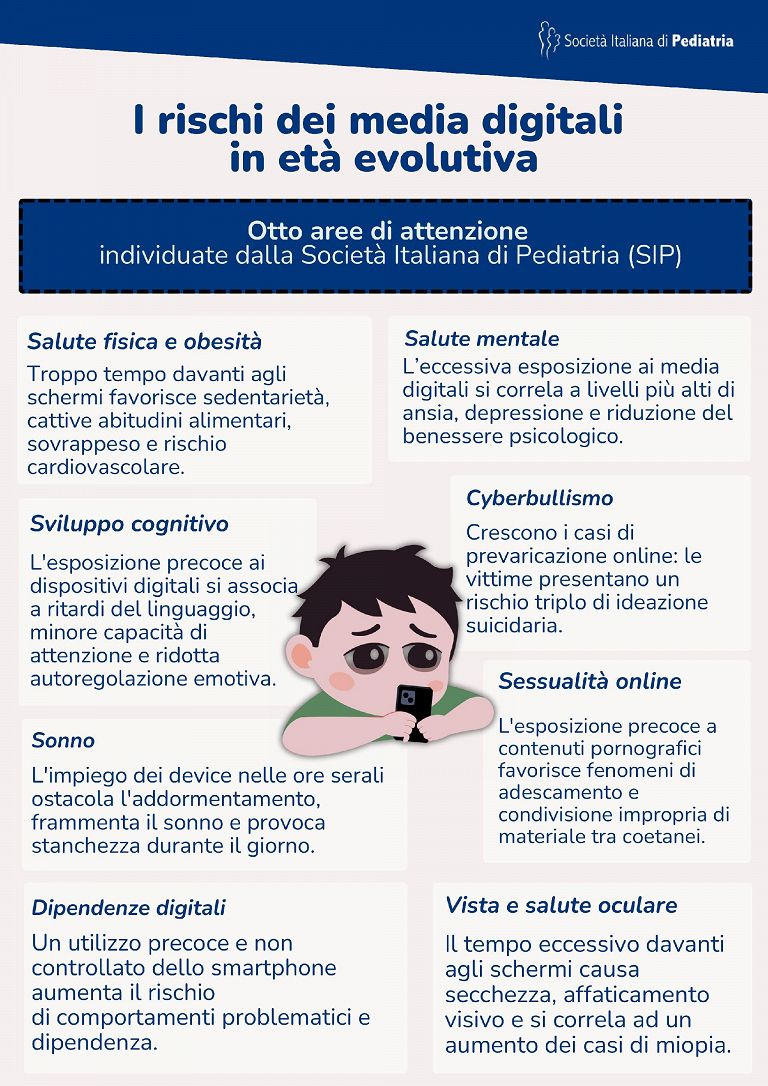Elena Bozzola, coordinatrice della Commissione Dipendenze Digitali della SIP, sottolinea l’importanza di ridurre il tempo trascorso davanti a uno schermo. Secondo la Bozzola, l’eccesso di schermi nei bambini al di sotto dei 13 anni è associato a ritardi nel linguaggio, diminuzione dell’attenzione e peggioramento della qualità del sonno. Negli adolescenti, i rischi si ampliano, con un aumento dell’ansia, dell’isolamento e della dipendenza dai social media.