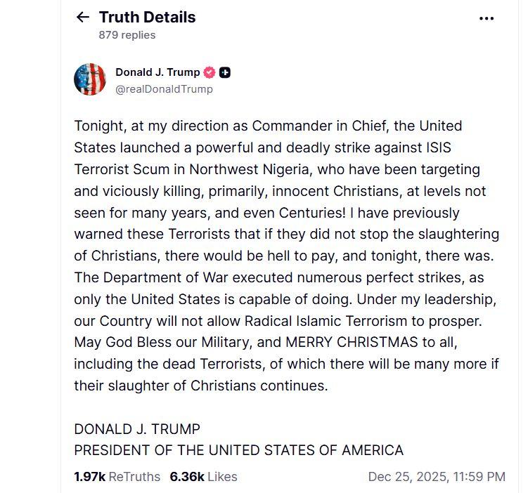Il presidente degli Stati Uniti, Donald Trump, ha reso noto che il 25 dicembre 2025, durante la notte di Natale, gli Stati Uniti hanno condotto un “attacco potente e letale contro elementi dell’Isis nella Nigeria nordoccidentale“. Questa operazione è stata comunicata attraverso il social network Truth, dove Trump ha sottolineato la brutalità dei terroristi, in particolare nei confronti di cristiani innocenti.